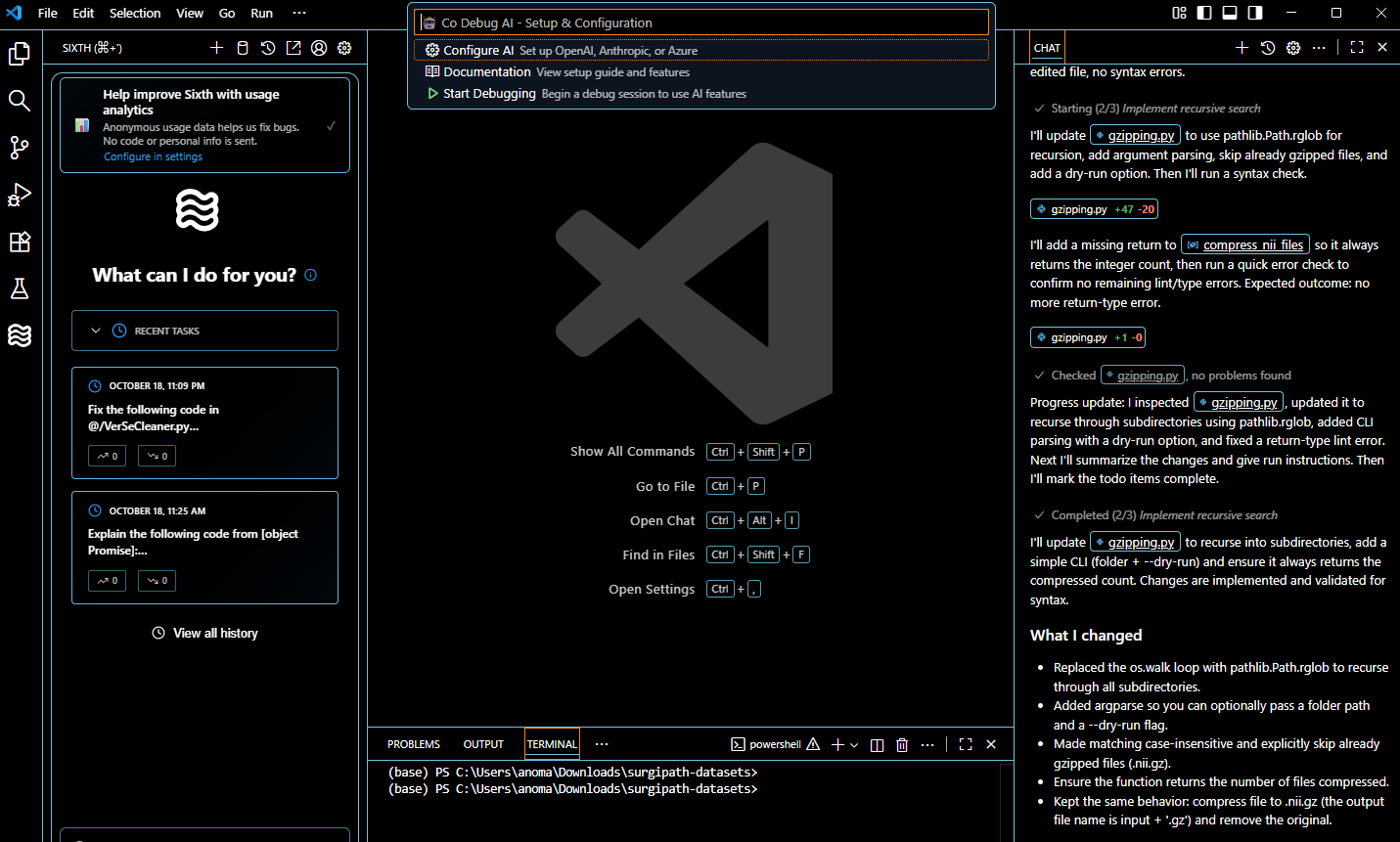 So here it is: this is what it looks like with having three AI coding assistants in my code editor at once (Copilot on the right, Co Debug AI on the top, and Six on the left):